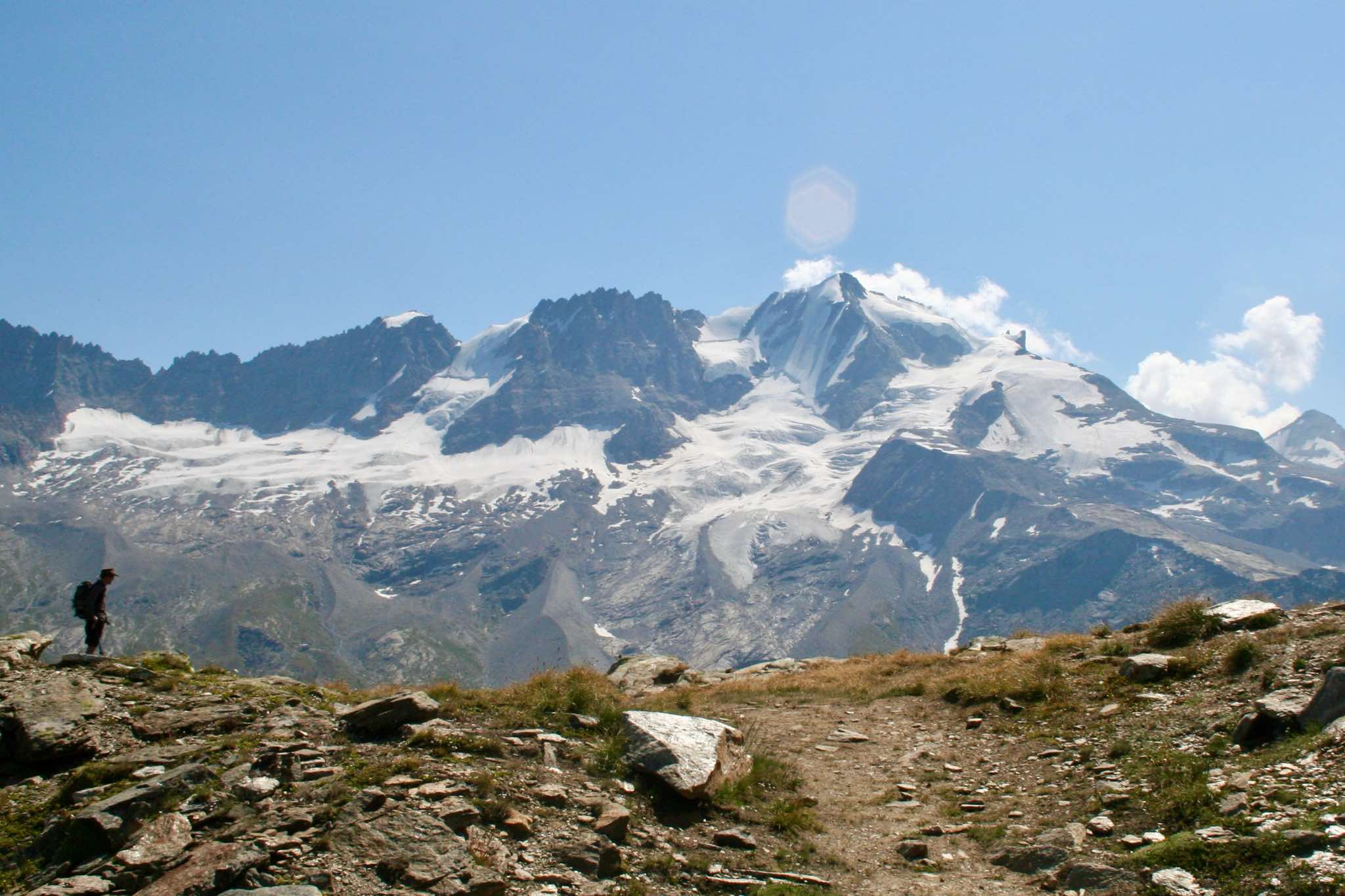 Crossing a mountain pass with a view to the Gran Paradiso summit.  -
