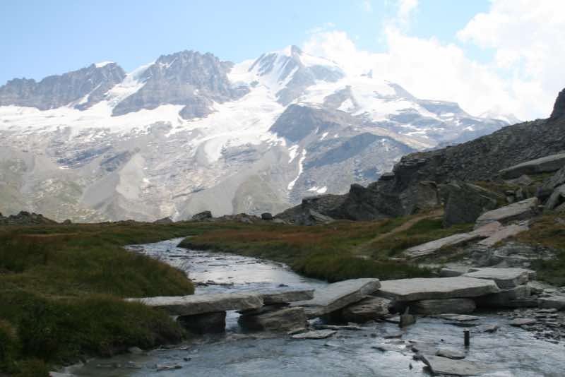 Crossing a stream with a view to the Gran Paradiso mountain, which at 4061m is the highest mountain in the region and shares it's name with the Gran Paradiso national park.  -